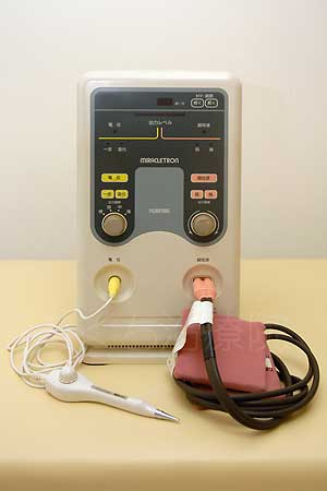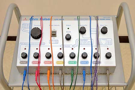 身体に挿した鍼を電極として身体に低周波電流を流し、筋肉を弛めます。疼痛緩和にも効果的です。チャンネル数が多いほど高い効果が上がるので、当院では8チャンネルのものを使用しています。他にチャンネル数の少ない小型のものもあり、そちらは必要に応じて在宅治療にも持参します。 |