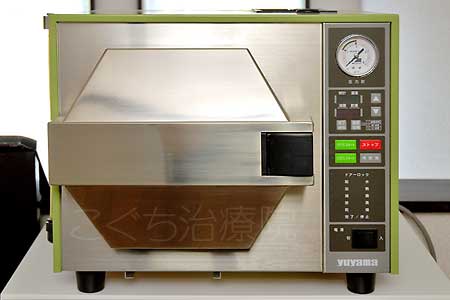 高圧滅菌消毒器です。治療に使う鍼は使い捨てですが、鍼皿は再使用しますので、この機械で滅菌消毒します。一回の治療毎に滅菌消毒したものと取り替えています。 |