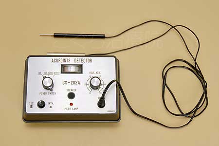 電位差を利用した反応点(つぼ)検出器です。通常、反応点は訓練を受けた施術者が触ればわかりますが、耳の中のように触って確かめるのが困難な場合、必要に応じてこの機械を使って正確な反応点の位置を探します。耳つぼ治療の際などに使うことがあります。 |
