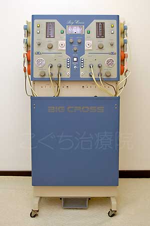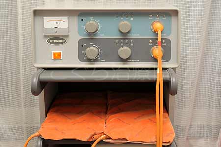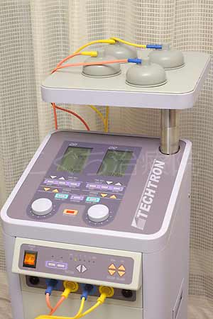 最新型の中周波治療器。電流を流して筋肉を運動させ、血流促進をもたらして疼痛緩解をはかることは低周波治療器と同じですが、低周波独特の刺激感がないため、低周波が苦手な方の治療にも効果をあげることができます。また筋肉の運動によりダイエット効果も得られます。 |